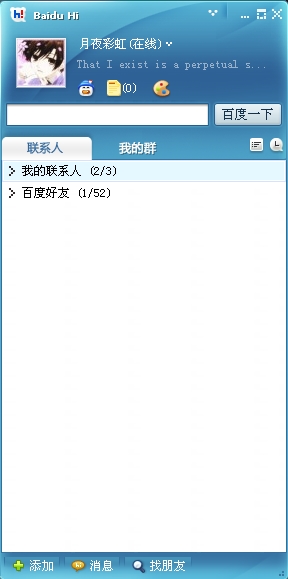 才知道百度进军IM了,出了个”百度HI”,被人邀请试用,激活了HI然后用了下,感觉相当好用,接下来我给大家看2软件的截图
